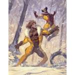 The Wolverine vs Sabretooth Fine Art Print features half brothers Logan Howlett and Victor Creed as they face off in an unforgiving frozen forest. Wolverine leaps into the air with a snarl, his Adamantium claws extended. Ready to strike his opponent out of the sky is Sabretooth, teeth bared in fury.