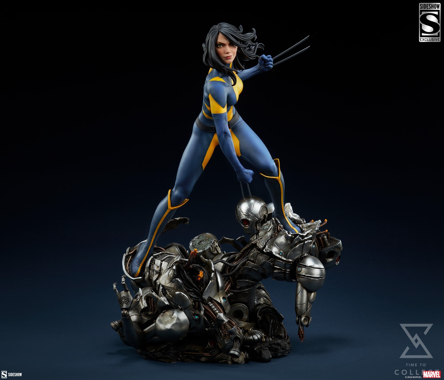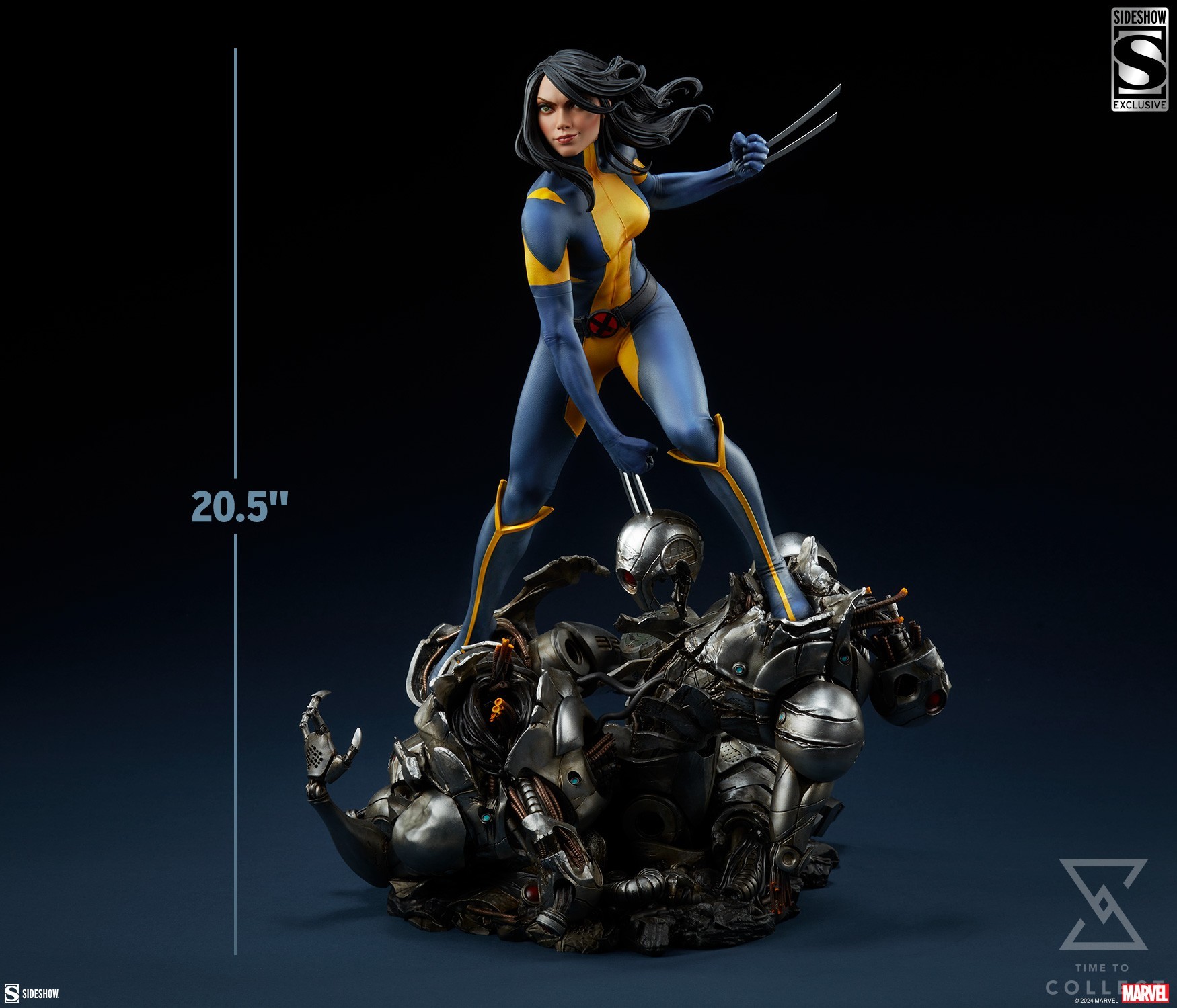 Danger Room drones, meet Laura Kinney’s fists — and fury. Measuring 20.5” tall, 15” wide, and 13.3” deep, the Wolverine: X-23 Uncaged Premium Format Figure finds this legacy mutant at the end of an intense training session. Laura wears her All-New Wolverine era costume while balancing on a metallic mountain of defeated adversaries. She looks ahead with well-earned confidence as her Adamantium claws plunge into a robot’s severed head, dealing the final blow. Simulation complete!