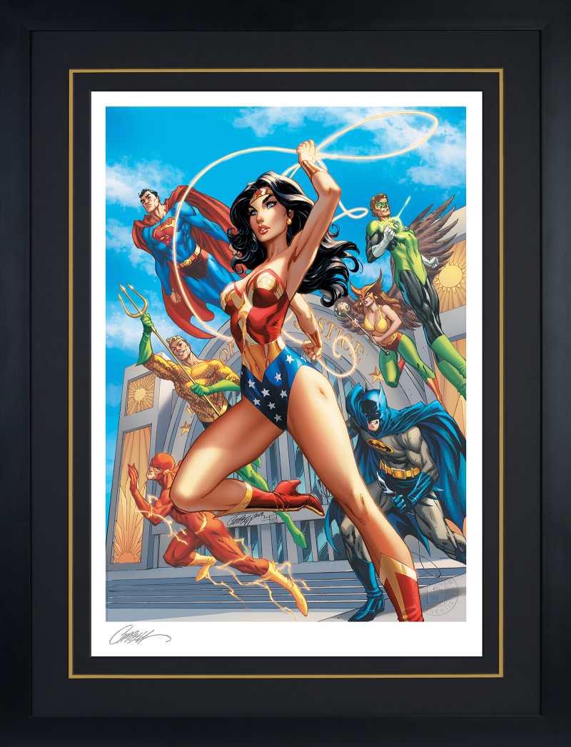 With her golden Lasso of Truth held high, Wonder Woman leads her friends and allies forward in this dazzling team illustration by J. Scott Campbell, whose iconic art style is adored by comic fans everywhere. Diana of Themyscira is joined by Superman, Aquaman, The Flash, Batman, Hawkgirl, and Green Lantern as they spring into action outside of their headquarters, the Hall of Justice. Their strength, speed, compassion, willpower, and pursuit of justice ensure that the world of man will always see a brighter future, fulfilling the Amazon warrior’s promise to herself and all humanity.