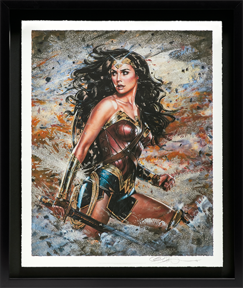 Based on Gal Gadot’s appearance as the iconic heroine Wonder Woman in Batman V Superman: Dawn of Justice, this print captures the Amazon in a moment of bravery and strength. In the midst of battle, Wonder Woman shows grace under fire thanks to her incredible warrior upbringing, clutching her sword and fearlessly facing whatever foe may stand in her path. Highlighted against the chaos of the battlefield, this Amazon warrior stands tall as a champion for peace in a tumultuous world.