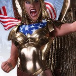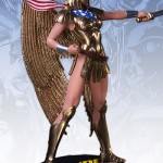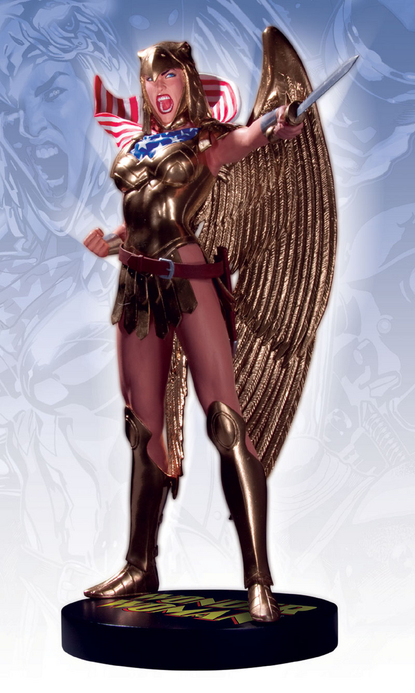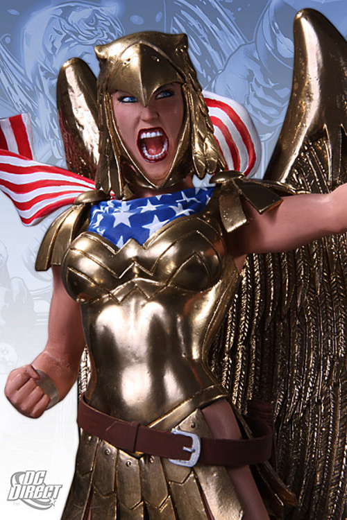 An armored eagle, Wonder Woman shouts a warrior’s battle cry. Golden wings for flight, with golden chest-plate, war-skirt and eagle’s head helmet designed to reflect the rays of the sun, blinding foes in their light. Carrying a Hephaestus-forged sword sharp enough to slice, the Amazon Princess epitomizes fierce in the midst of fight.
