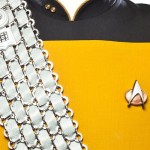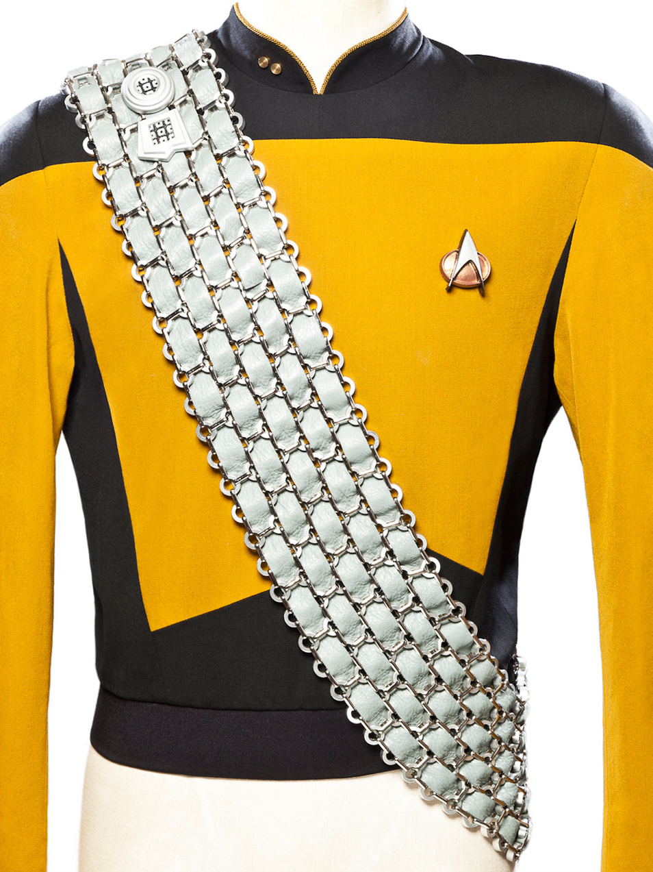 ANOVOS came to Bear and his team for a much needed production-worthy Worf Baldric Sash to be used in the The Big Bang Theory episode “The Bakersfield Expedition”. Constructing multiple sashes in record time, these metal and leather works of art completed the Worf outfit worn by character Raj, seen also wearing an exclusive ANOVOS TNG tunic with ANOVOS-produced accoutrement, including our high-end jewelry rank pips.