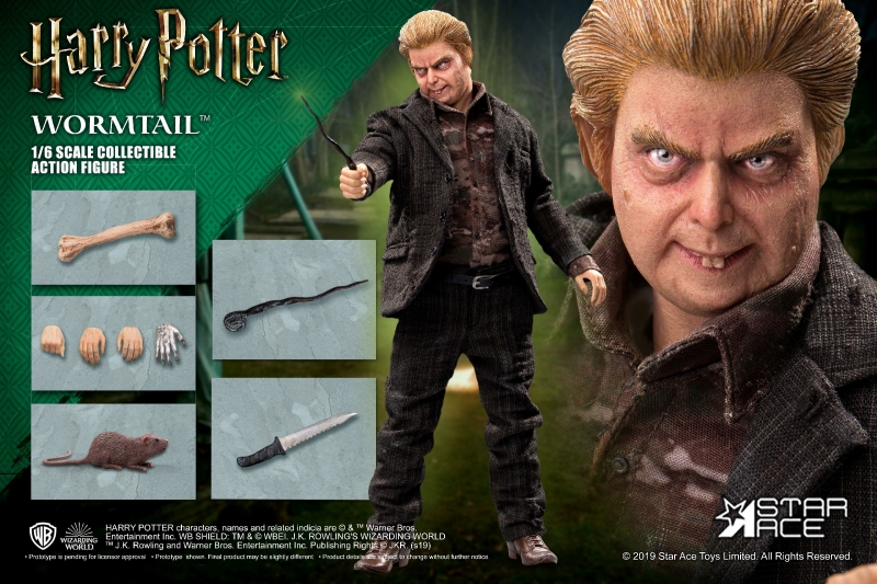 This 1/6th scale figure of Pettigrew features a lifelike portrait of Timothy Spall as Wormtail from Harry Potter and the Goblet of Fire. He comes with his wand, the knife used to take blood from Harry for the resurrection ceremony, the silver hand gifted to him by Lord Voldemort, a bone from the Dark Lord and his rat form – Scabbers. - The 1/6th Scale Peter Pettigrew (Wormtail) Collectible figure features:
