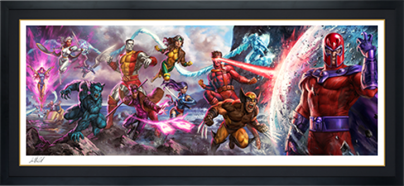 To me, my X-Men! Inspired by Jim Lee’s iconic 4-part cover for X-Men #1 by Chris Claremont and Scott Williams, a record-breaking book that sold over 8 million copies as a part of the 50th anniversary relaunch of the X-Men series, Ian MacDonald’s homage brings together Marvel’s most beloved mutants in an epic fight against their foe Magneto. This dynamic deluxe fine art print features 13 characters in all, including the talented telepaths Professor Xavier and Jean Grey, southern sweethearts Rogue and Gambit, the goddess Storm, Wolverine, and more.