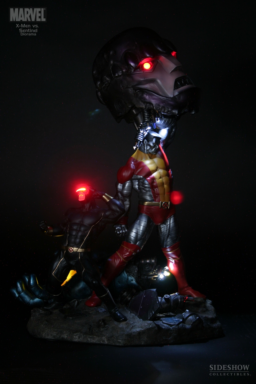 Colossus and Cyclops have teamed to defeat a massive Sentinel, recently relieved of both head and hand. Colossus stands triumphant with the Sentinels massive head held high, while Cyclops scans the horizon for signs of incoming attack. Continuing the Marvel Diorama series, X-Men VS Sentinel is an immense piece, standing over 19 tall. Each piece is hand cast and hand painted to exacting standards, and the underside of the base is printed with the artists signature and edition information.