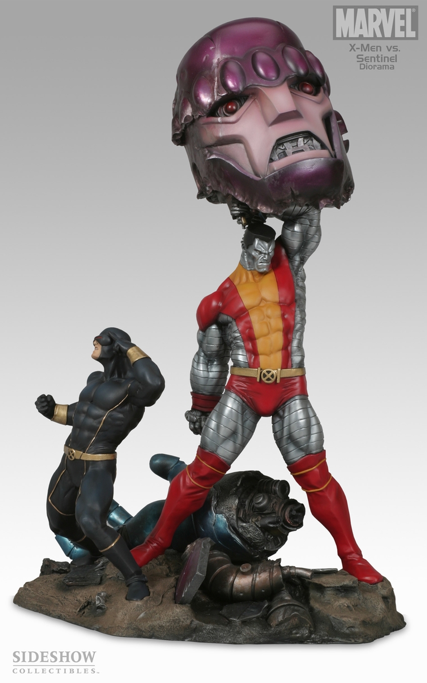 Colossus and Cyclops have teamed to defeat a massive Sentinel, recently relieved of both head and hand. Colossus stands triumphant with the Sentinels massive head held high, while Cyclops scans the horizon for signs of incoming attack. Continuing the Marvel Diorama series, X-Men VS Sentinel is an immense piece, standing over 19 tall. Each piece is hand cast and hand painted to exacting standards, and the underside of the base is printed with the artists signature and edition information.