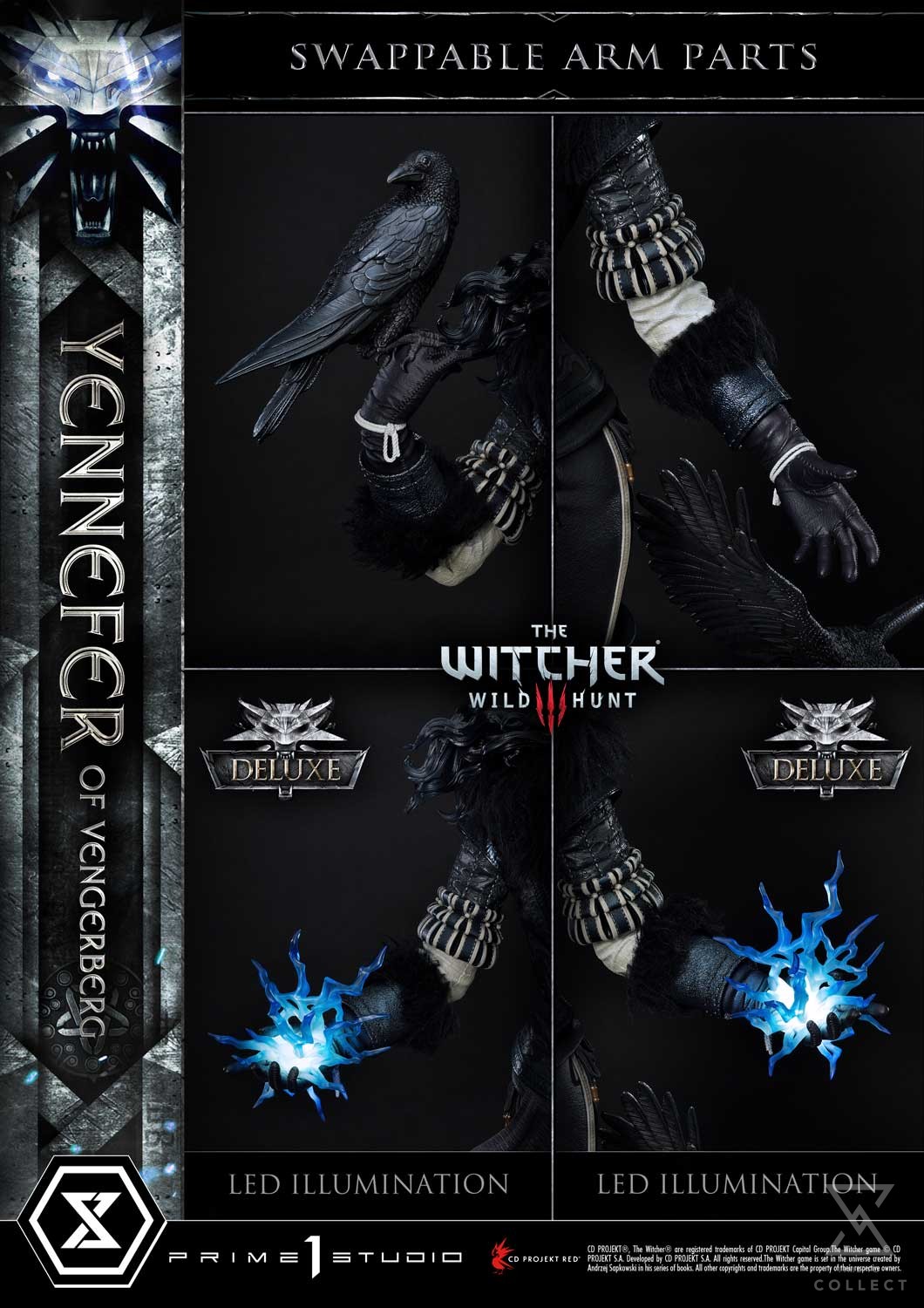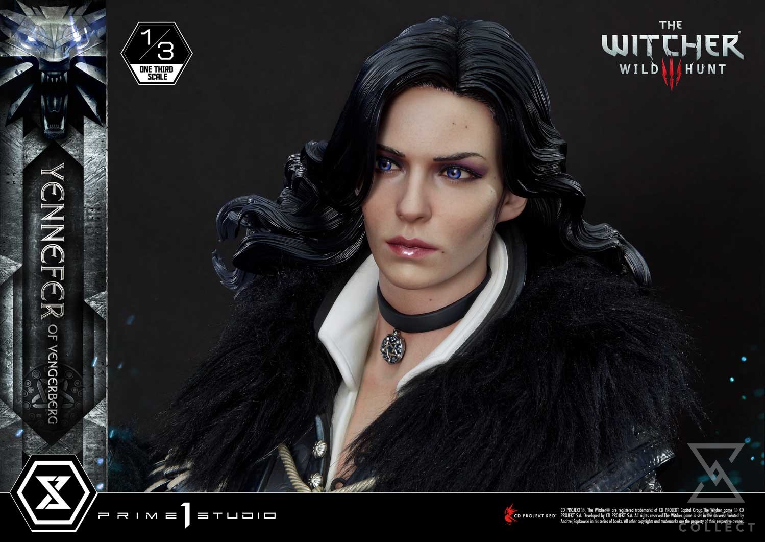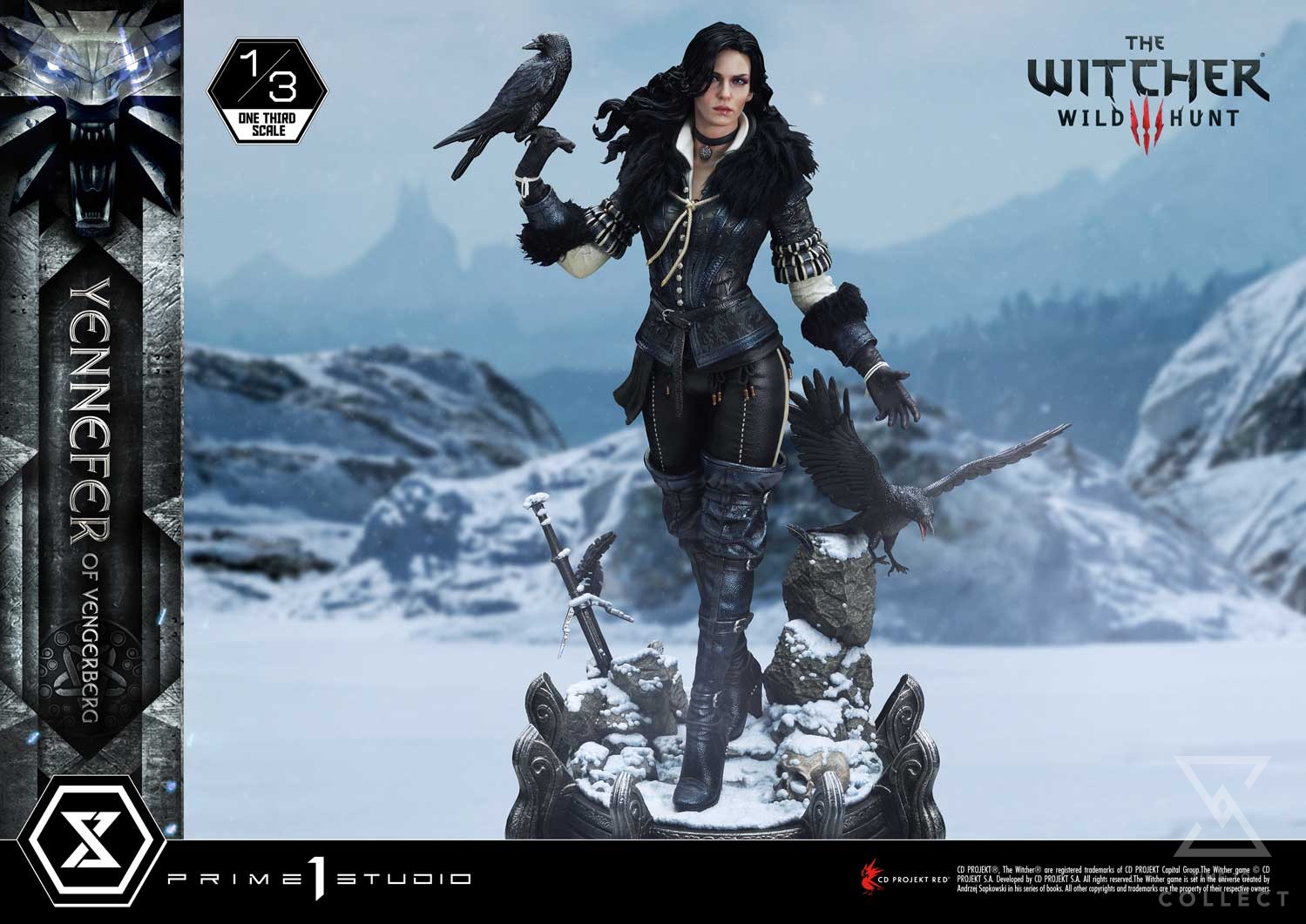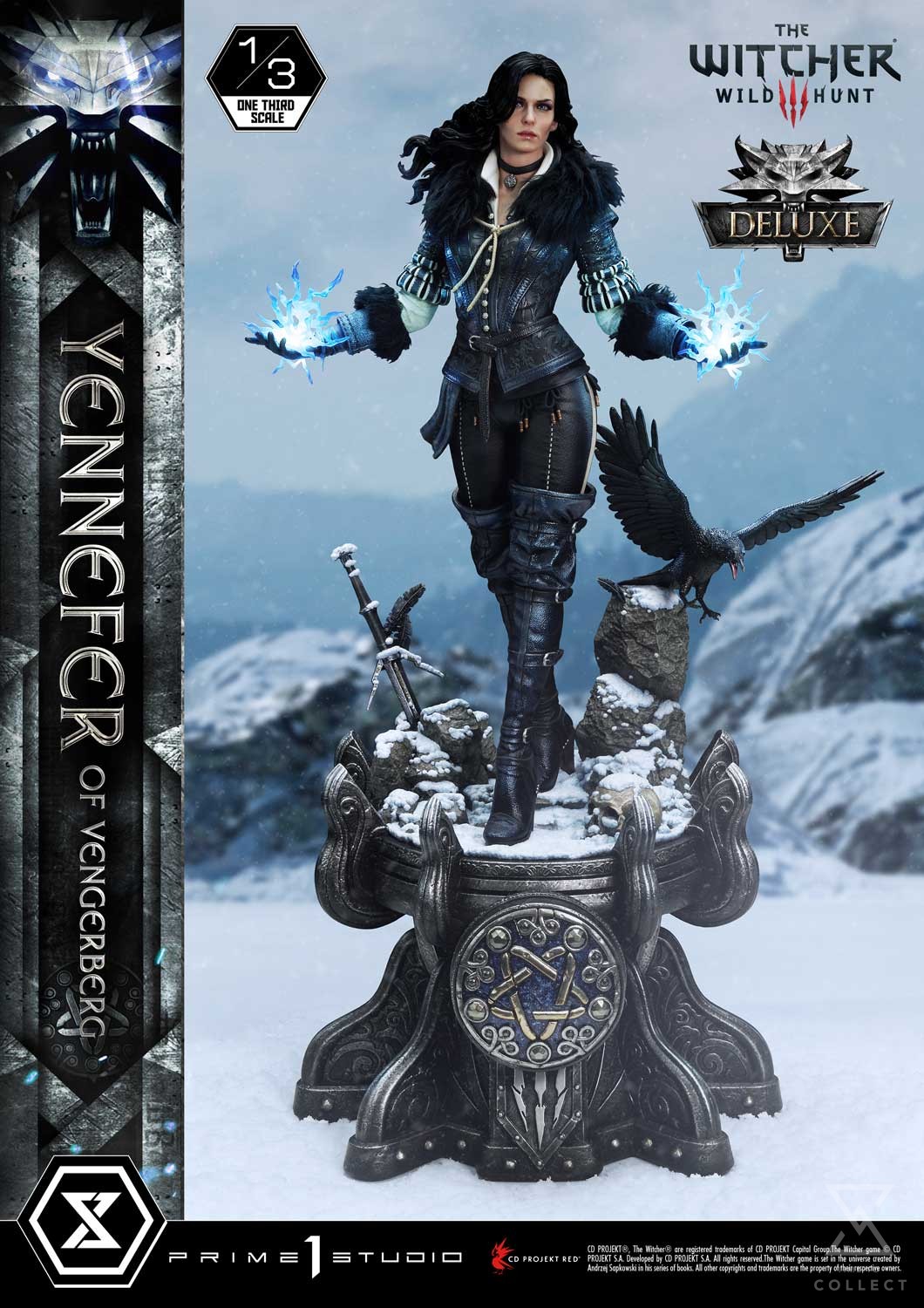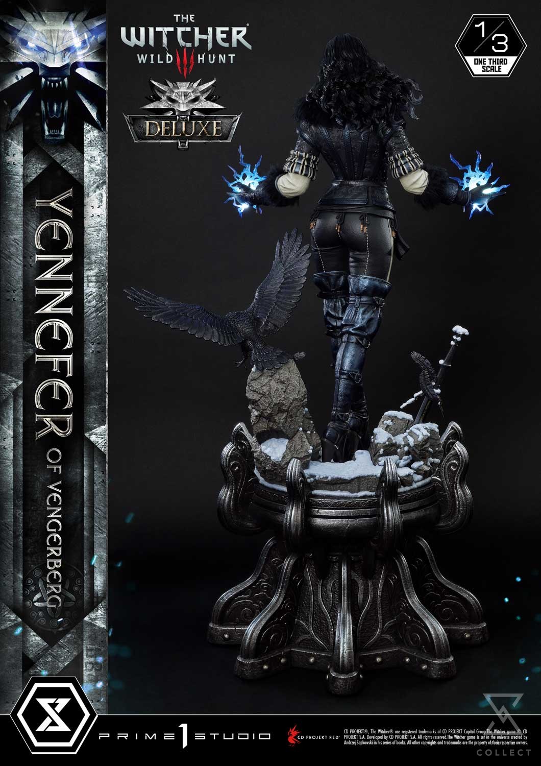 Prime 1 Studio is thrilled to present the next addition to our Museum Masterline Series! Behold the long awaited 1:3 scale MMW3-02DXS Yennefer of Vengerberg Deluxe Bonus Version from The Witcher 3: Wild Hunt. As many of you may already know, Yennefer of Vengerberg is one of the main characters of the franchise. Highly beloved by many fans, she plays a key role in both Geralt’s and Ciri’s lives. Her and Geralt’s story is one of passionate romance but it’s not without their own trials and tribulations. One cannot blame Geralt for being so madly in love with her. Standing at 33 inches tall, the Horsewoman of War poses gracefully, accompanied by two crows. One crow is resting on her right hand whereas her left hand is extending outwards, ready to cast a spell at any moment. With skin fair as snow, long, voluminous raven hair, and violet-colored eyes due to the elf blood that flows through her veins, she exudes a commanding presence that is hard to resist. The artisans at Prime 1 Studio have gone to great lengths to bring the sorceress to life with the utmost attention to detail. She’s wearing her distinctive and elegant attire, which properly reflects her status as a powerful mage that any citizen of The Continent may recognize. The leather vest accentuates her figure and features very intricate stitching and patterns. The black fur around the collar and arms keeps her warm during her travels. Knee-high boots complement her looks and provide both style and mobility for combat. She stands atop a base lined with a fine layer of snow, indicating that she is currently roaming through the colder regions of Skellige. With Geralt’s sword planted in a rock at her feet, surely she is not too far from Kaer Morhen, ancestral home to the Witchers. The Deluxe version lets you expand the storytelling by adding two swappable hand parts. With her palms facing upwards on both sides, Yennefer is channeling LED-illuminated lightning magic. And when you order the Bonus Version from our official store or any authorized distributor, you will receive an additional right-hand part: Yennefer casting lightning magic at another angle, this time closer to her shoulder line. Fans of Yennefer and The Witcher series, it’s time to celebrate! Pre-order the MMW3-02DXS Yennefer statue to add this beautiful piece to your collection which is sure to make you smell the sweet fragrance of lilac and gooseberry… figuratively of course!