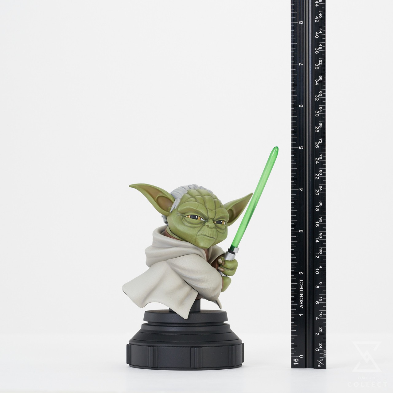A Gentle Giant Ltd. release! Begun the Clone Wars have! The line of Star Wars animated-style mini-busts continues with the reveal of Yoda! Measuring approximately 5 inches tall with his lightsaber raised, this detailed bust is based on his appearance in the Clone Wars animated series and sits atop a black pedestal. Limited to only 2,000 pieces, it comes packaged in a full-color window box with a numbered certificate of authenticity.