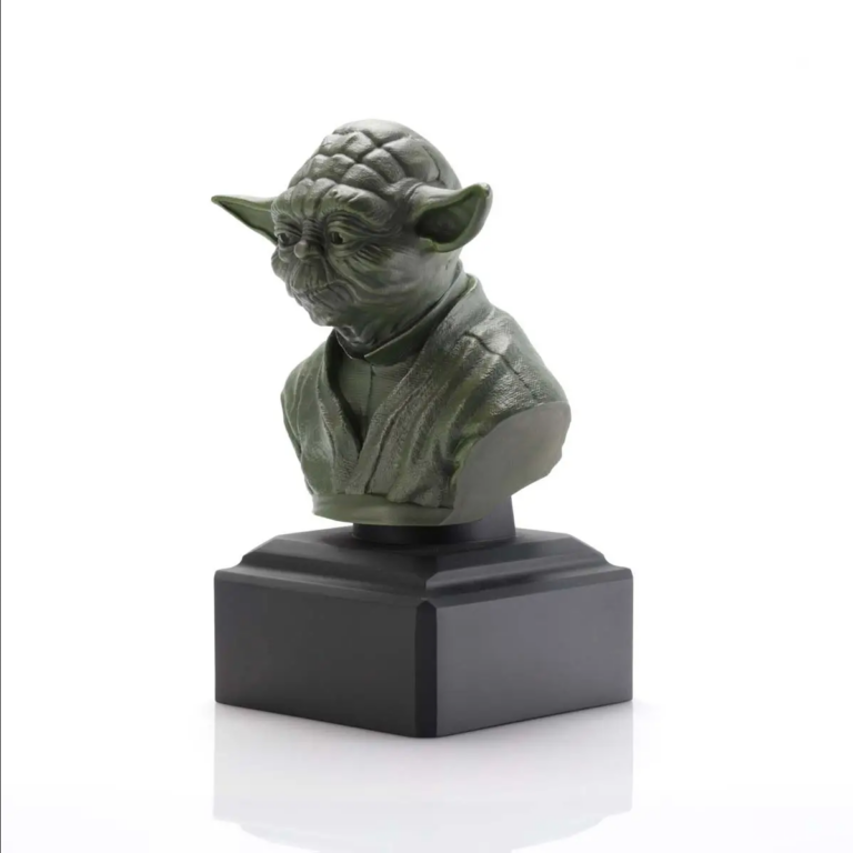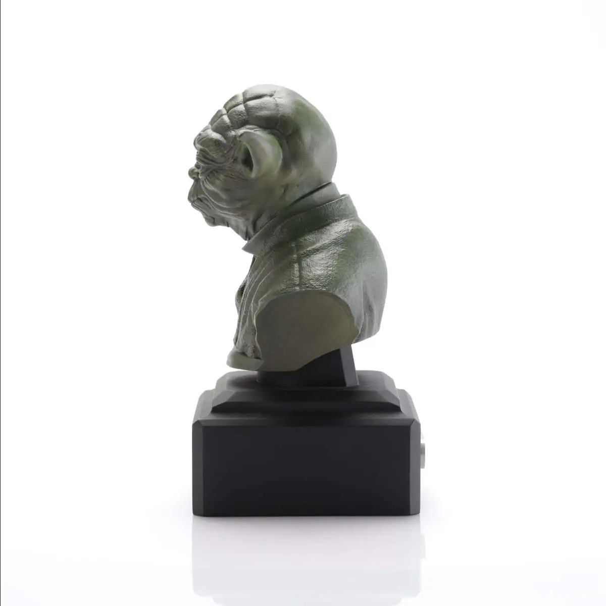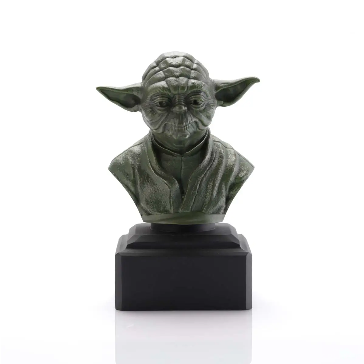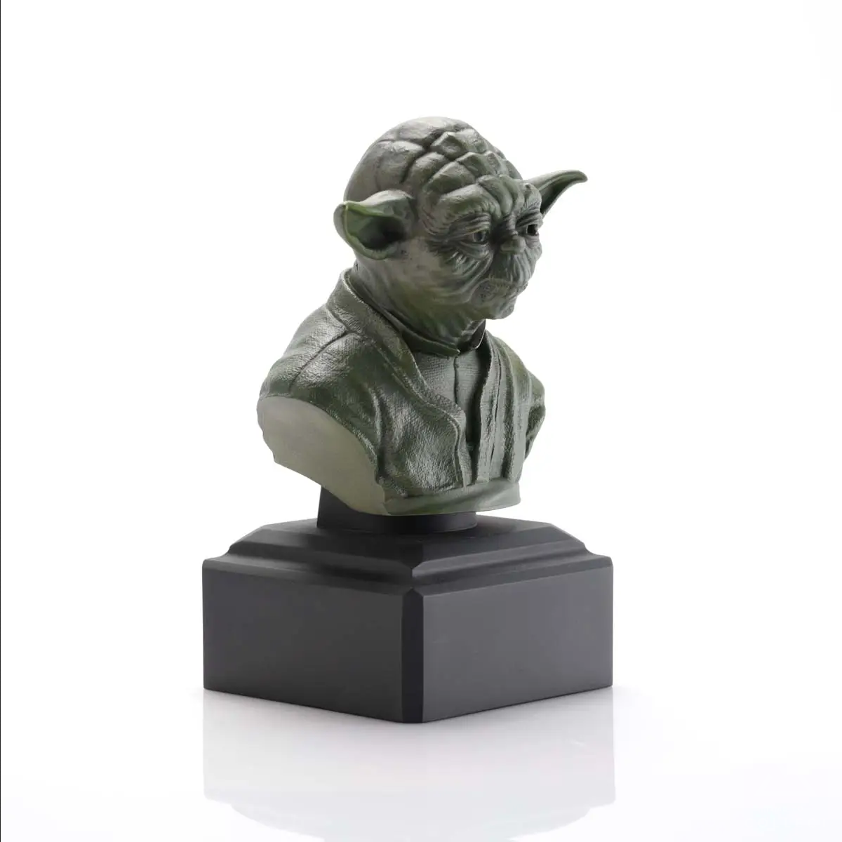 This limited edition bust captures the physical attributes that define Yoda; large elfin ears, a slight stature, and the features that speak of a life lived over nine hundred years. Cast in pewter, finished with a graphite-enhanced tint to approximate his distinctive skin tone, on a pedestal of composite resin.