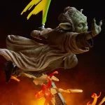 Witness a master rising! The Yoda Mythos Statue measures 17” tall and 11.75” wide, capturing a glimpse of the agile and enigmatic alien during his younger days as a galactic peacekeeper. 900 years old he is not, as he leaps through the smoldering, shattered wreckage of a ship’s hull with ease in this gravity-defying pose. His lightsaber™ is extended and his arm is outstretched as the fierce battle continues. Though short of stature, Yoda proves that even the smallest being can make the biggest impact through the living Force.