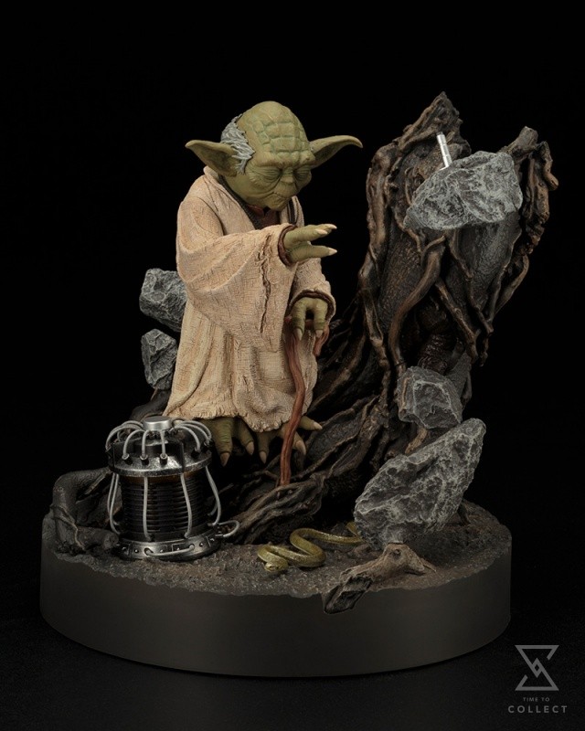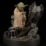 Having exiled himself to hide from the evil Empire, the former head of the Jedi Order waits on the swampy planet of Dagobah where one day a young Jedi hero will find him. Meanwhile Yoda keeps up his Force skills by levitating rocks and other items from his perch on a stunted tree. Wearing his old ragged robes and carrying his gimer stick cane, the diminutive Jedi Master is intricately sculpted with all of the wrinkled green character’s ancient charm. Yoda’s tree is decorated with an incredibly detailed texture and convoluted vines, while the floating rocks are craggy and broken. The venerable hero features two interchangeable heads for your choice of display options: eyes open and patiently observant or closed in intense concentration. As with other recent ARTFX releases, Yoda’s base comes equipped with LEDs; the small lamp on the floating rock and the power generator on the ground both light up!