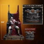 An expression tinged with irritation. Ash-white skin marked by profound loss. Muscles swelling like carved stone. Every sculpted and painted detail conveys the warrior in his entirety. Weathering is etched into the golden gauntlets and greaves, while the waistcloth shows realistic wear and fraying. The Blades of Chaos visible behind him are captured down to the finest nuances of their design. Beneath him lies a massive ancient Greek throne, and the vivid crimson drapery falling elegantly from it summons memories best left unspoken.