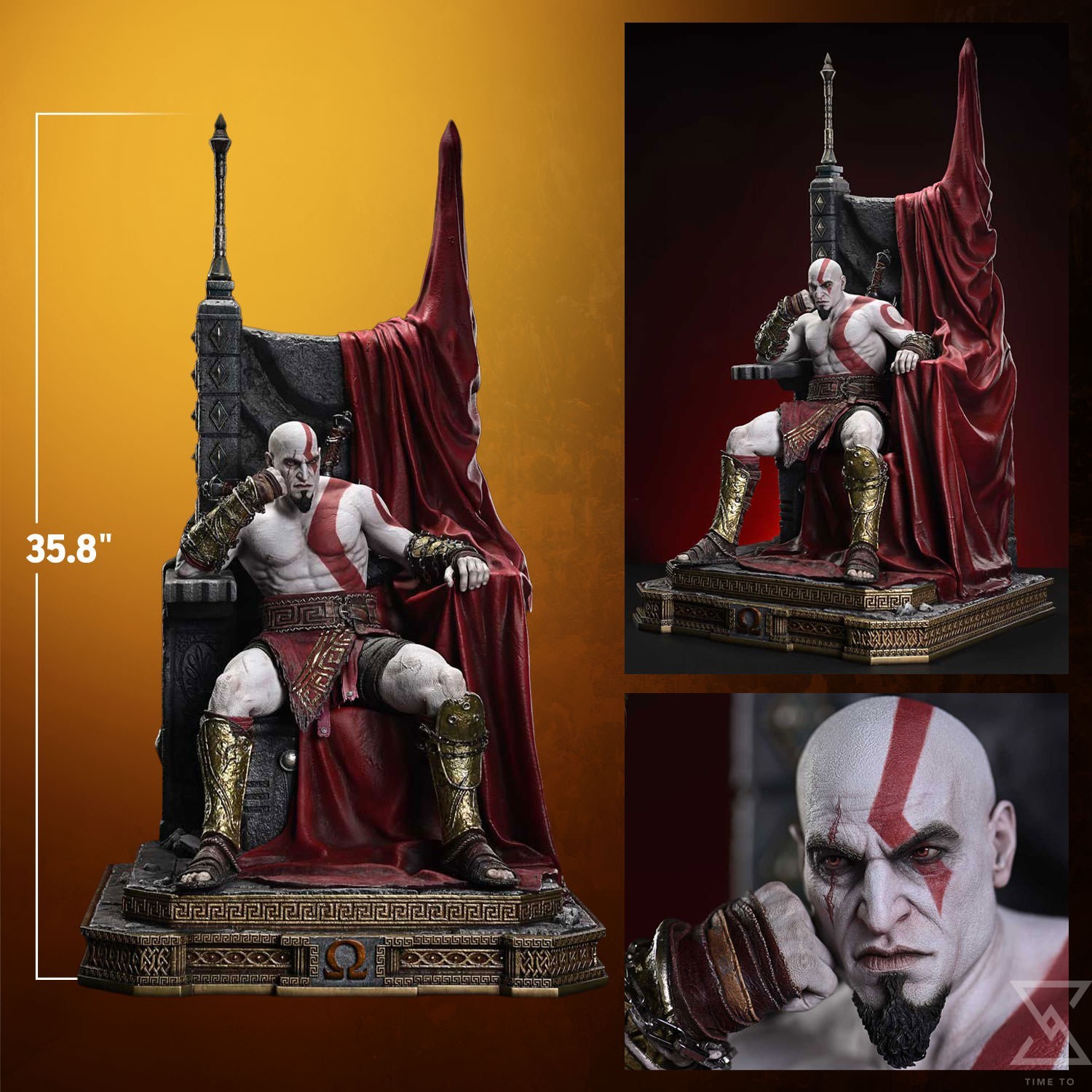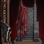 An expression tinged with irritation. Ash-white skin marked by profound loss. Muscles swelling like carved stone. Every sculpted and painted detail conveys the warrior in his entirety. Weathering is etched into the golden gauntlets and greaves, while the waistcloth shows realistic wear and fraying. The Blades of Chaos visible behind him are captured down to the finest nuances of their design. Beneath him lies a massive ancient Greek throne, and the vivid crimson drapery falling elegantly from it summons memories best left unspoken.