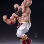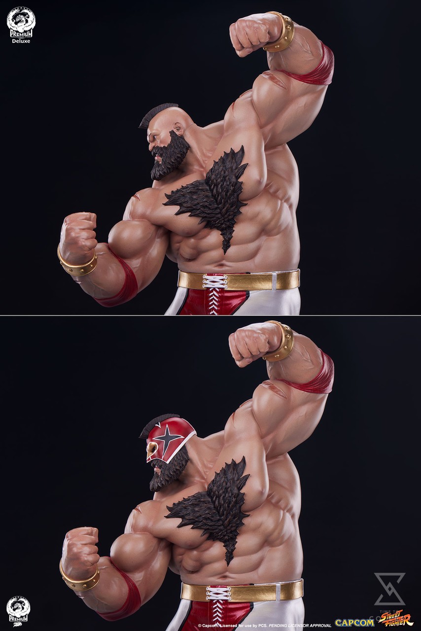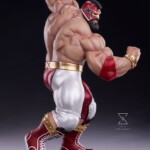 The Zangief 1:4 Statue stands atop a black museum style base, maintaining a consistent style with previous Street Fighter offerings from PCS. The Deluxe Edition includes an additional swap-out portrait depicting Zangief’s masked appearance in Street Fighter 6.