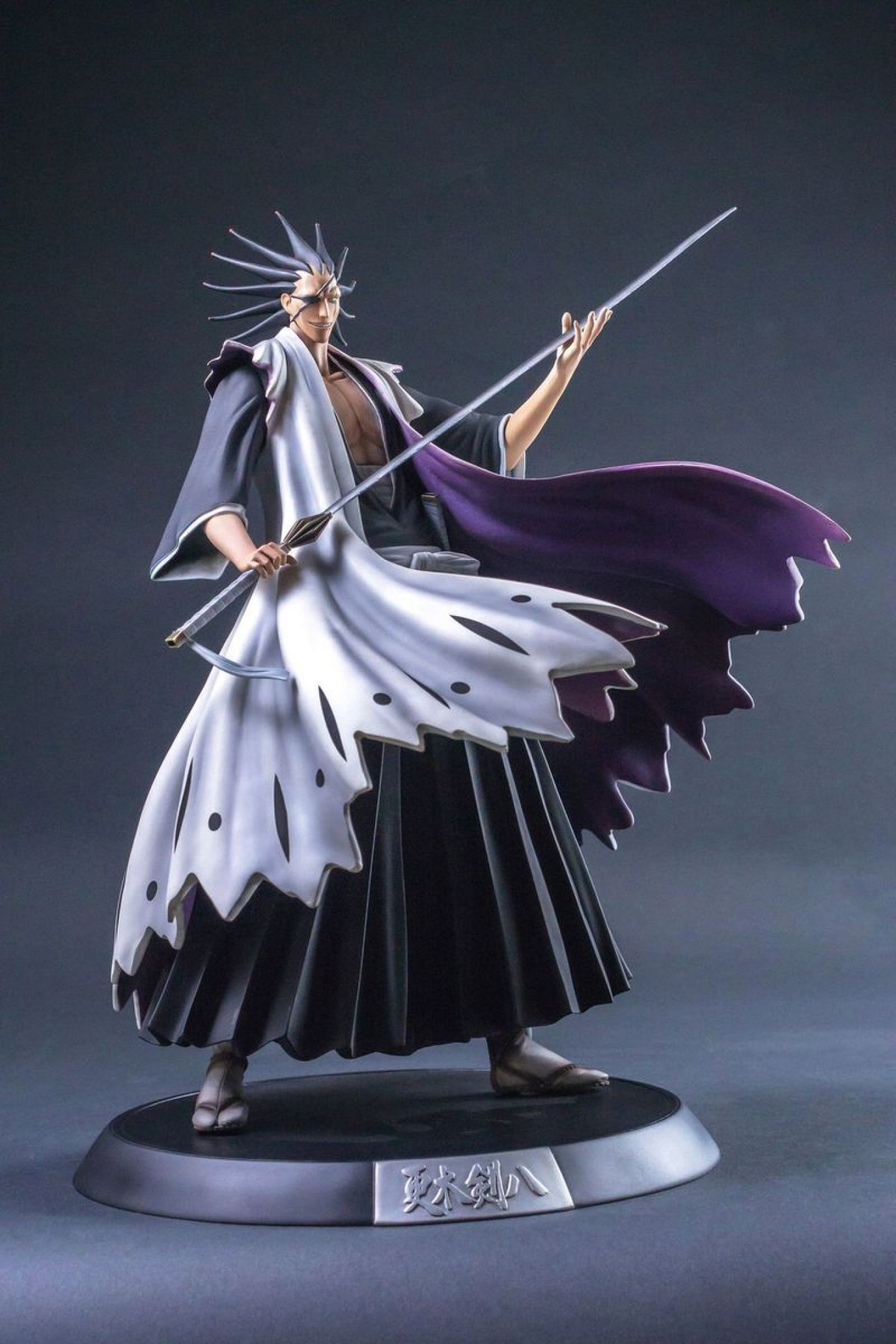 He keeps the blindfold in most cases, it allows him to contain his power to better “play” with opponents who don’t have the same level. Also, he uses a single blade that has taken many shocks, its brute force alone is enough … Kenpachi is a powerful character, we wanted to show that power across the span of his cloak, giving a natural aura. The work of draping is pushed to the maximum, white mantle got many effects. The face is full of details, the scar, pointed teeth and bells.