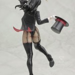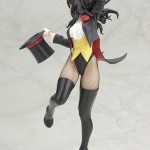 Using sleight of hand as well as her considerable beauty, Zatanna distracts you, her audience, as she prepares to pull something out of her hat. The magician looks like she is frozen in mid-performance, wearing her stage costume and sculpted in a unique pose. Zatanna balances on one foot with the other pulled up under her as she leans to the side, dramatically aiming her wand at her outstretched top hat. The beguiling sorceress wears her classic costume, a feminine version of a traditional magician’s outfit with high heeled boots, fishnet stockings, white gloves, a black bodysuit, and a complex top with tuxedo elements. There is an incredible amount of sculpted detail in Zatanna’s intricate clothing as well as her long, flowing hair and captivating bishoujo-styled face.