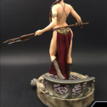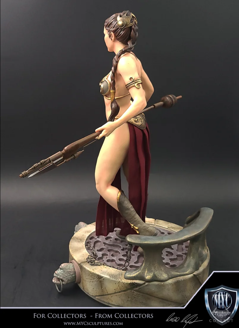 The captured Han is delivered to Jabba by the bounty hunter Boba Fett (Jeremy Bulloch) and placed on display in the crime lord’s throne room as a decoration. Lando Calrissian (Billy Dee Williams), droids C-3PO (Anthony Daniels) and R2-D2 (Kenny Baker), Leia, and Chewbacca infiltrate Jabba’s palace to save Han. Leia is able to free Han from the carbonite, but she is caught and enslaved by the Hutt. Chained to Jabba, she is forced to wear her iconic metal bikini.